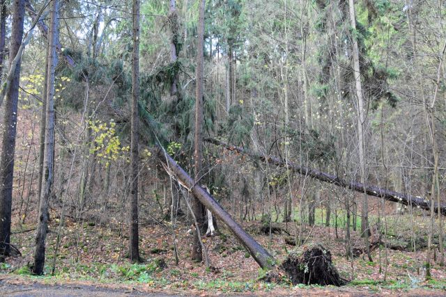 Po nedělním zasažení našeho regionu orkánem Herwart (svou silou se přiblížil orkánu Kyrill před deseti lety) nám v křivoklátských lesích zůstalo velké množství popadané hmoty. Nejedná se vesměs o velké kalamitní holiny, ale všudypřítomné jednotlivé stromy, převážně zlomené či navrácené a zavěšené do okolních stromů. Takto poškozené stromy mohou kdykoliv spadnout na zem, a to i za naprostého bezvětří, v těchto dnech lesníci intenzivně zjišťují množství poškozených stromů a postupně zajišťují zprůjezdnění lesních cest a celkové zpracování polomů. V rámci lesnického parku se první odhady pohybují v rámci tisíců kubíků poškozeného dřeva.