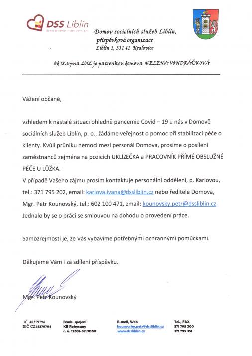 žádost o pomoc na pozici pracovníka sociálních služeb, uklízečka.